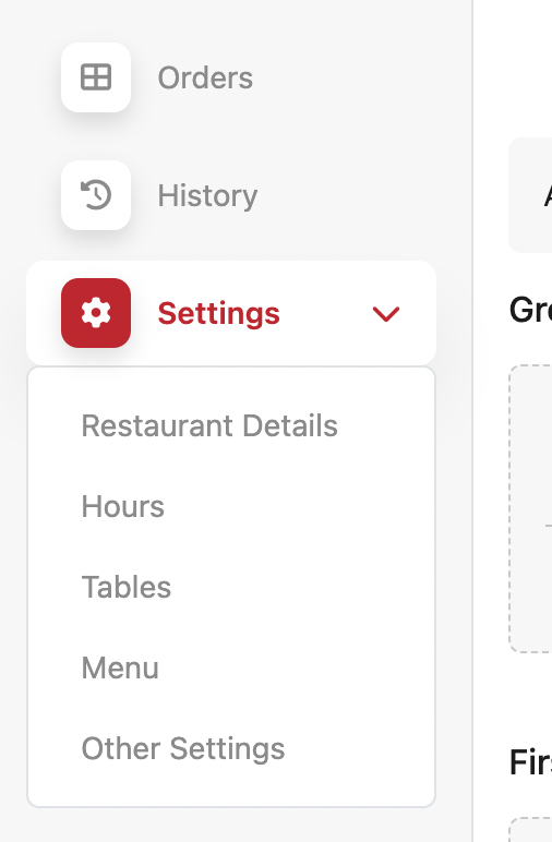 Expanding Settings reveals the following subcategories:Restaurant Details: Update your restaurant name, type, and address.