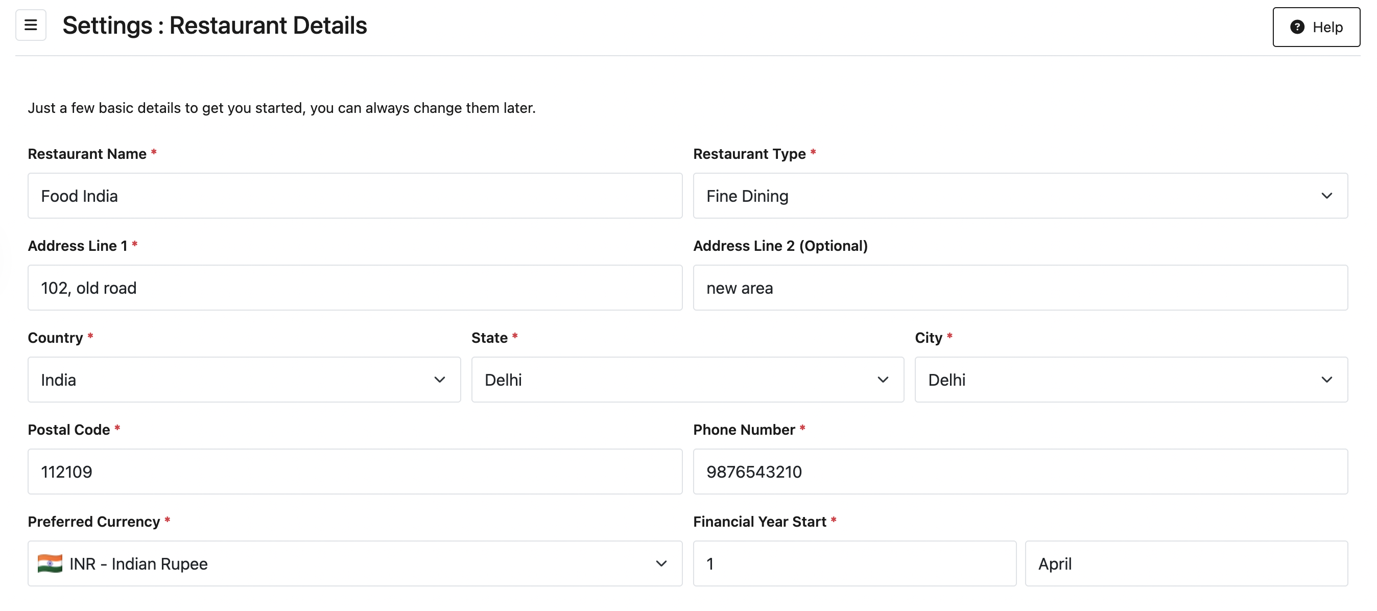 Restaurant Details: Update your restaurant information, tax details, and government registrations.