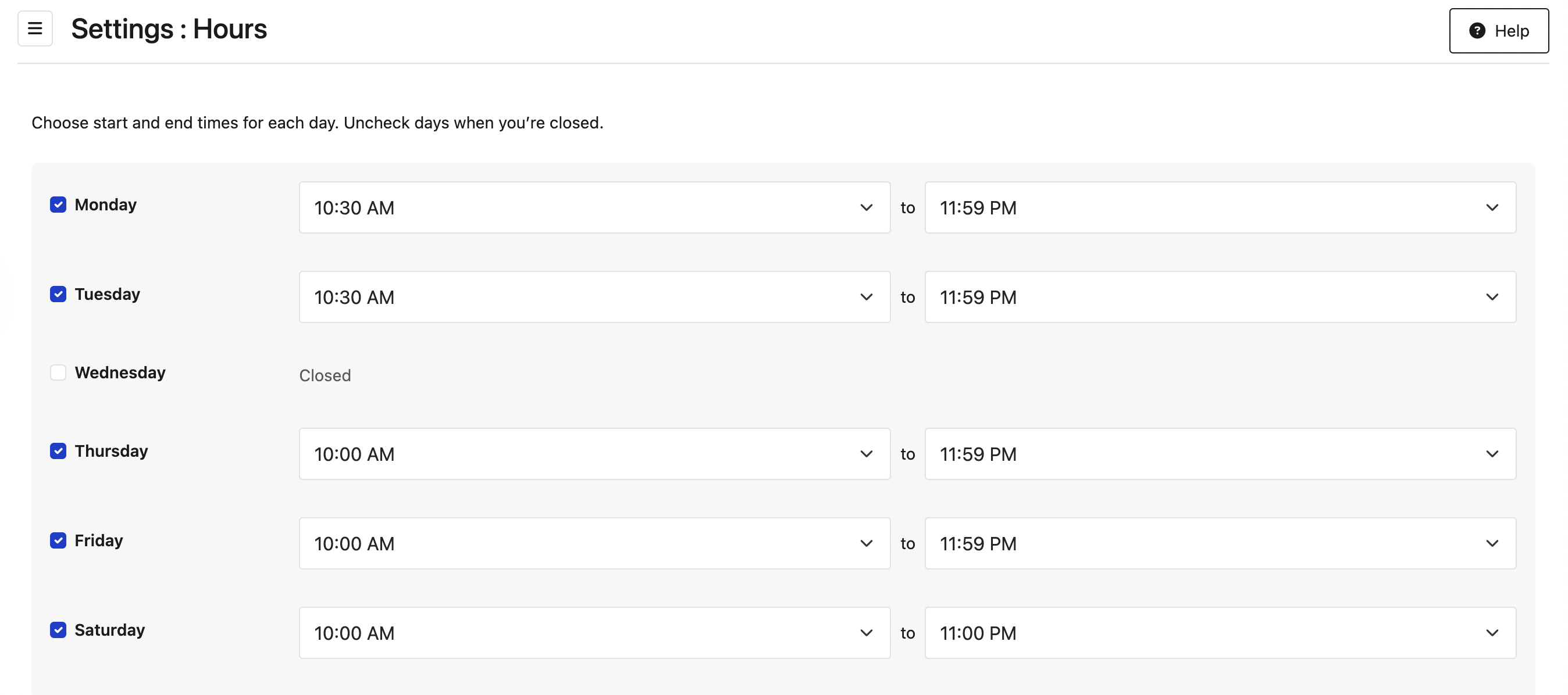 Menu: Add and edit menu categories, items, sizes, and add-ons.