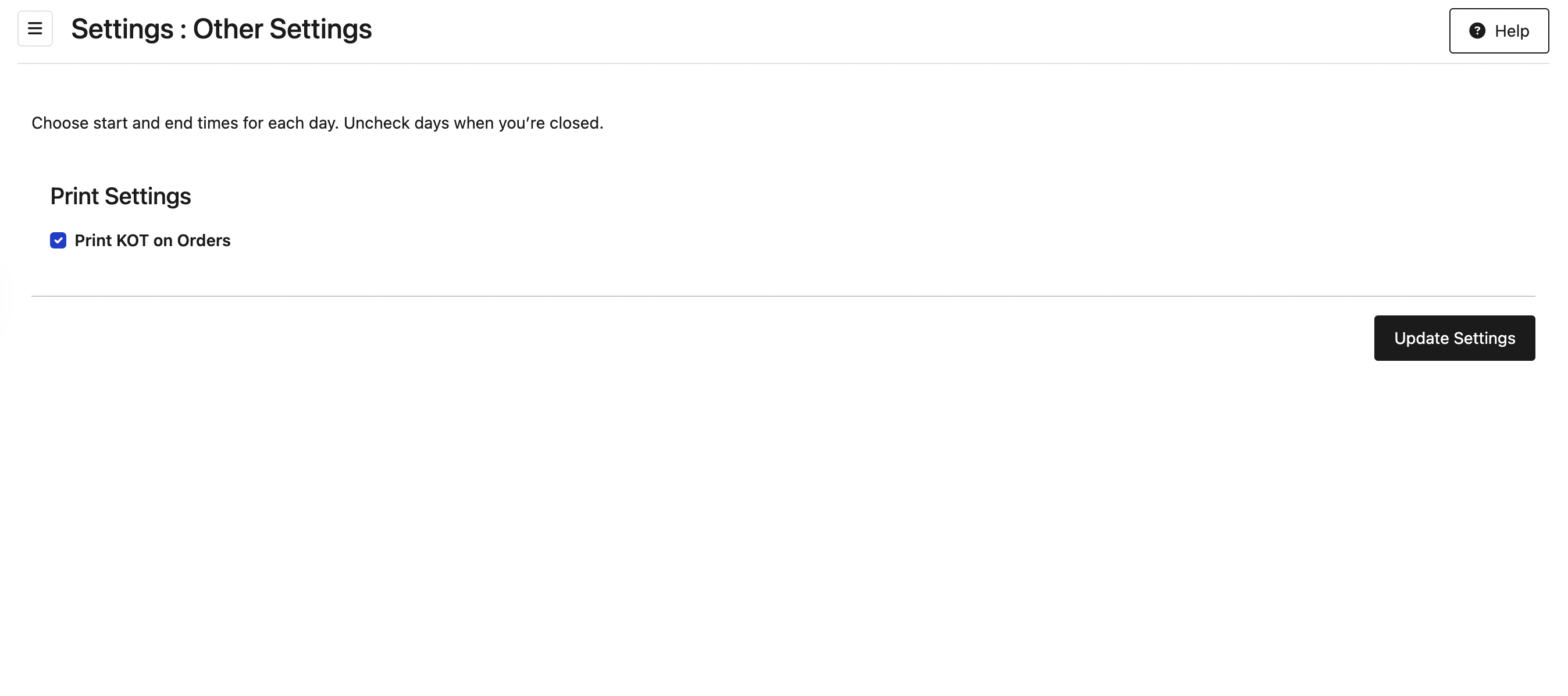 Print Settings: Enable or disable “Print KOT on Orders.”