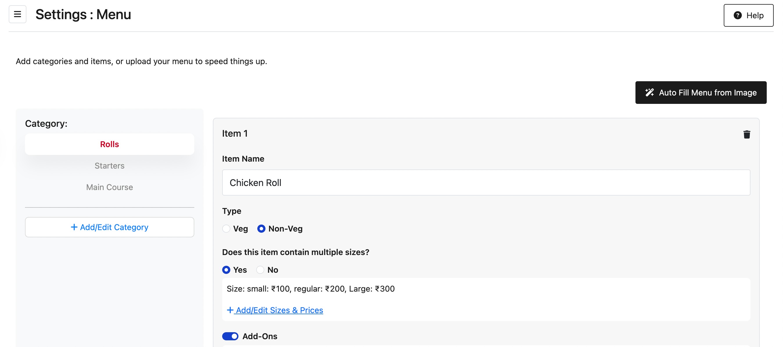 Use the Auto Fill Menu from Image option if you want to upload your existing menu.