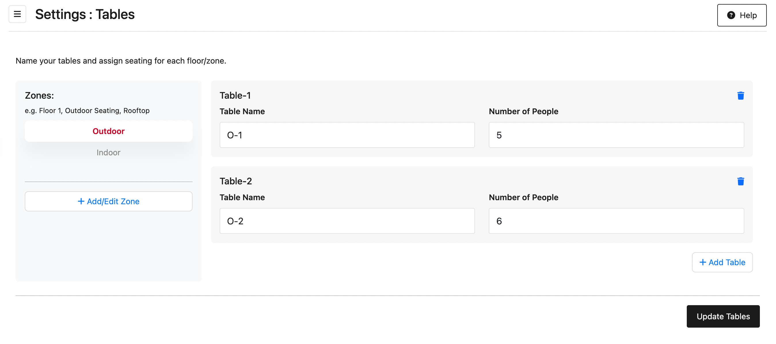 For each floor or zone, add tables and specify the number of people each can seat. Each floor must have at least one table.